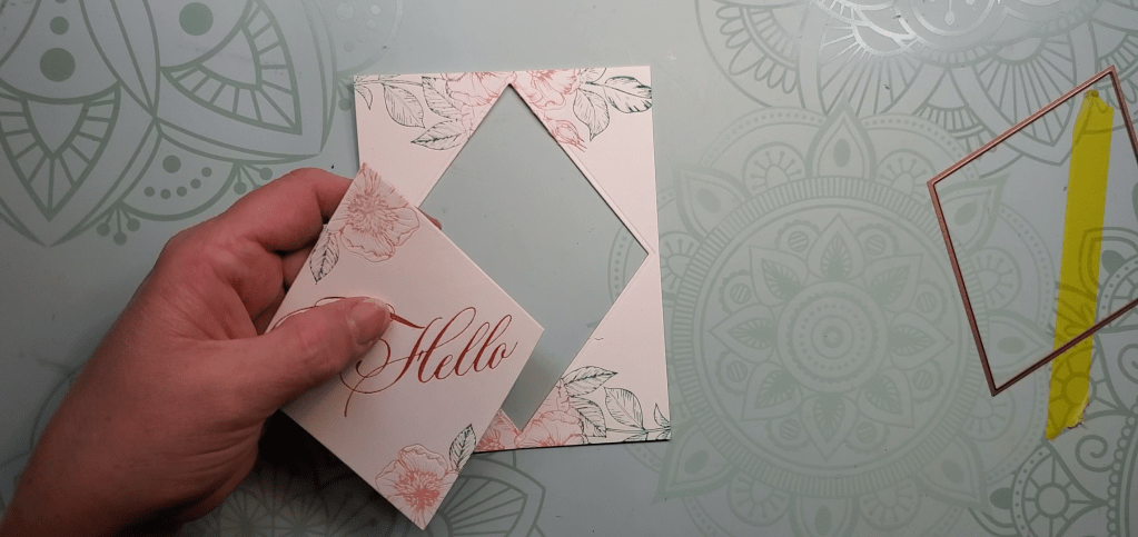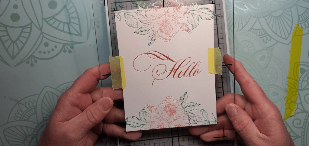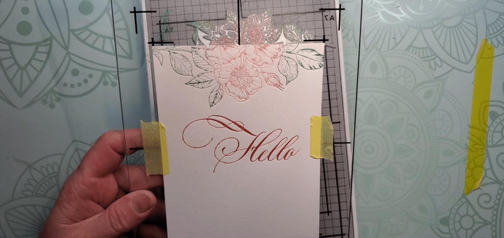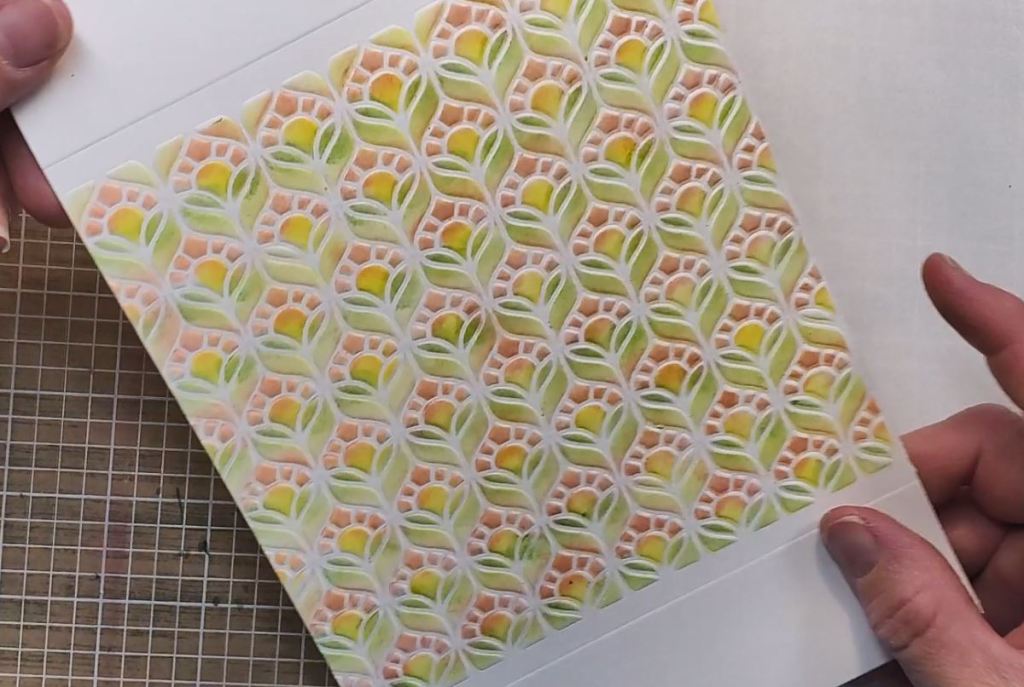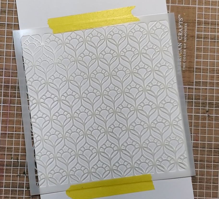 The second step is to add color to the card panel. First, put the stencil back over the embossed card panel and tape it down.