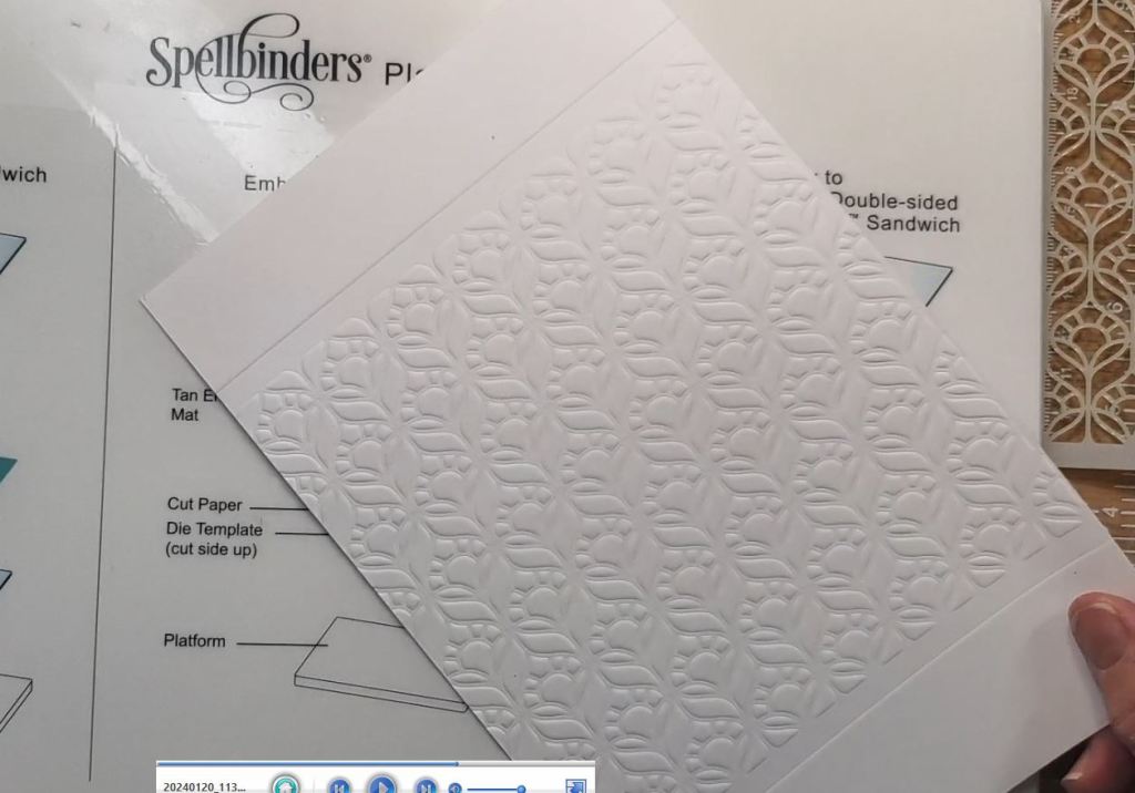 The technique used to create the background for these cards was done using a stencil to dry emboss a piece of cardstock. Basically, it is using the stencil like an embossing folder. To do this, I used the brown embossing pad that comes with my Spellbinder’s Platinum 6 die cutting machine along with the blue embossing plate instead of the clear cutting plates. The result is a dry embossed card panel.