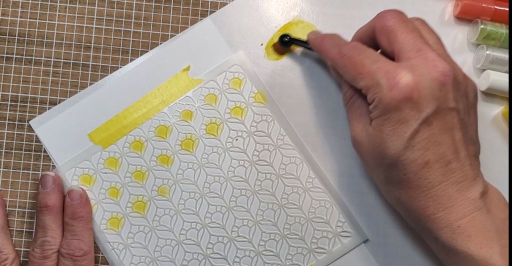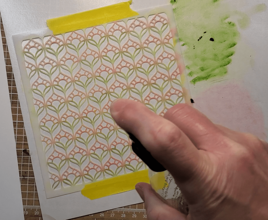 Next, add some color through the stencil. Here’s how: rub gelatos on an Amazon Basics Palette Pad or any nonstick surface; use a blender brush (the one I used is from Amazon and it’s technically a make-up brush) to pick up the color and rub them over the stencil to add color to the card panel. The image below shows the beginning of this process. I added other colors as well.