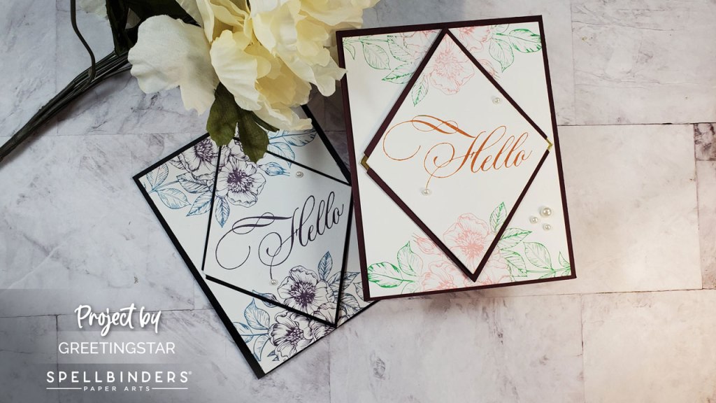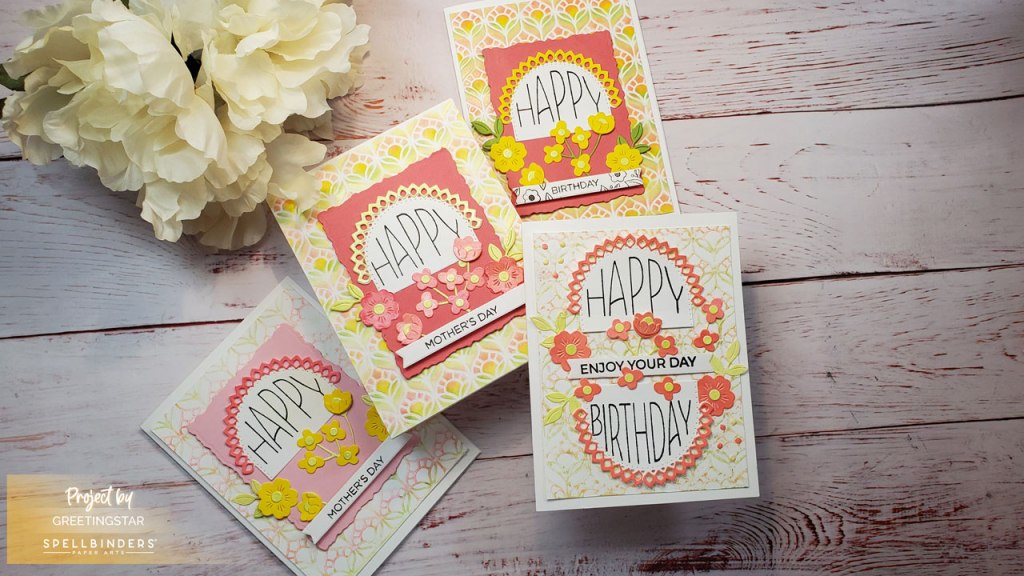These beautiful cards were made using dies, stamps, and a stencil from the Spellbinder’s Kaleidoscope Arch Collection. The collection includes a BetterPress Plate as well, but I did not buy it or use it for these cards.