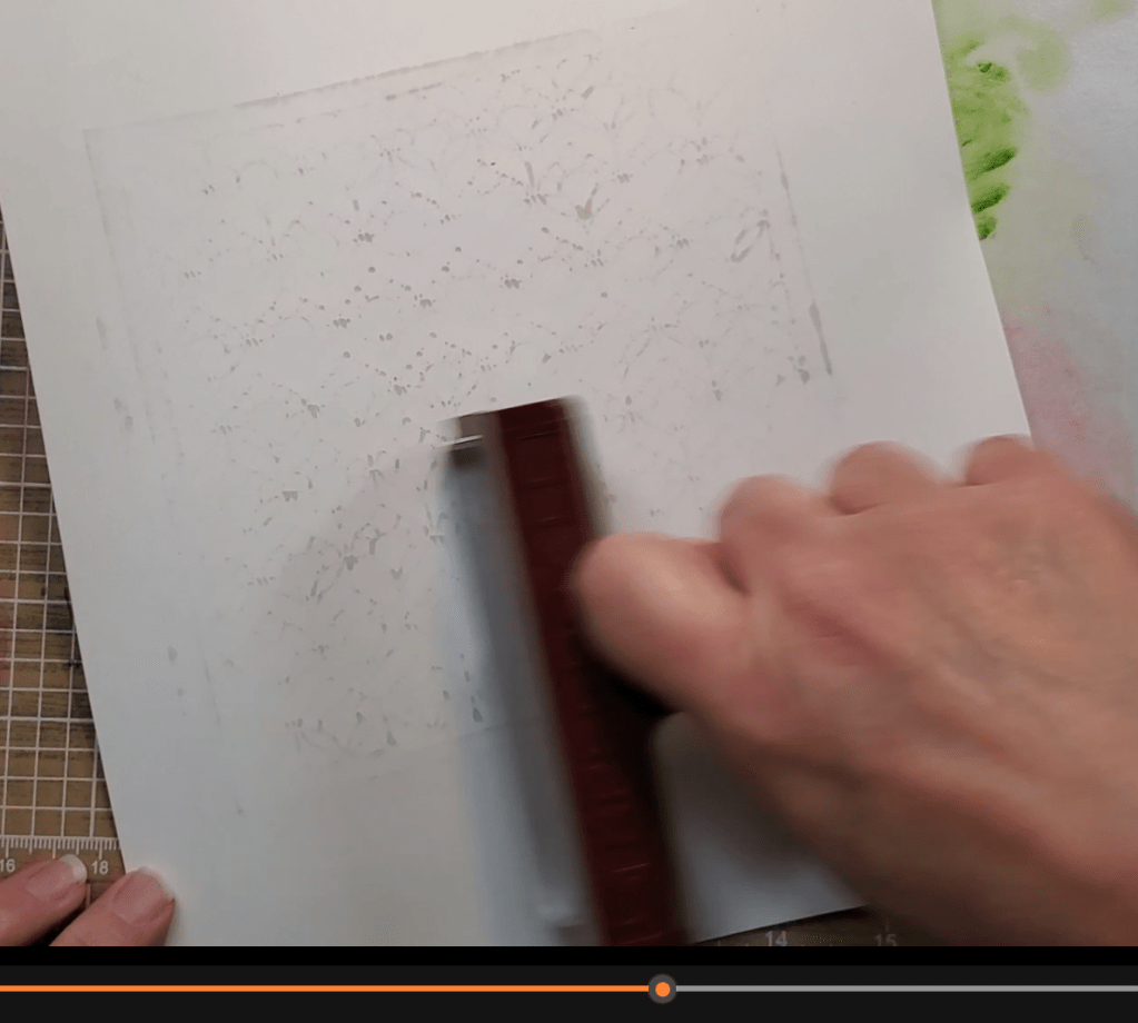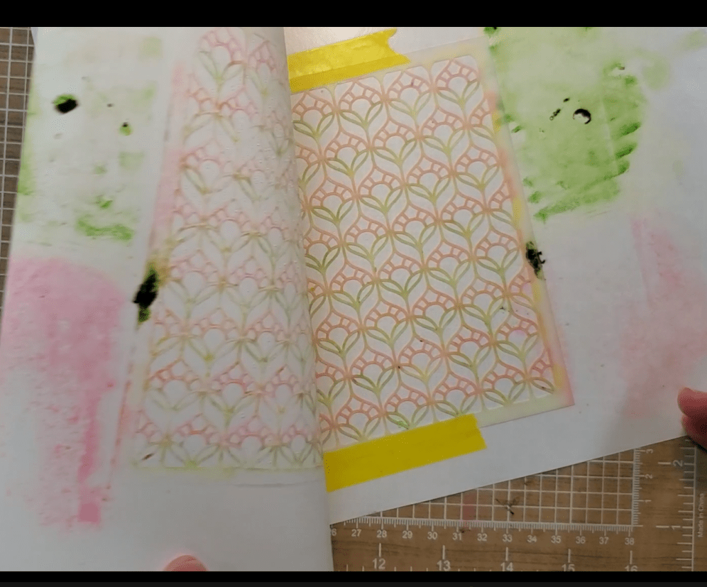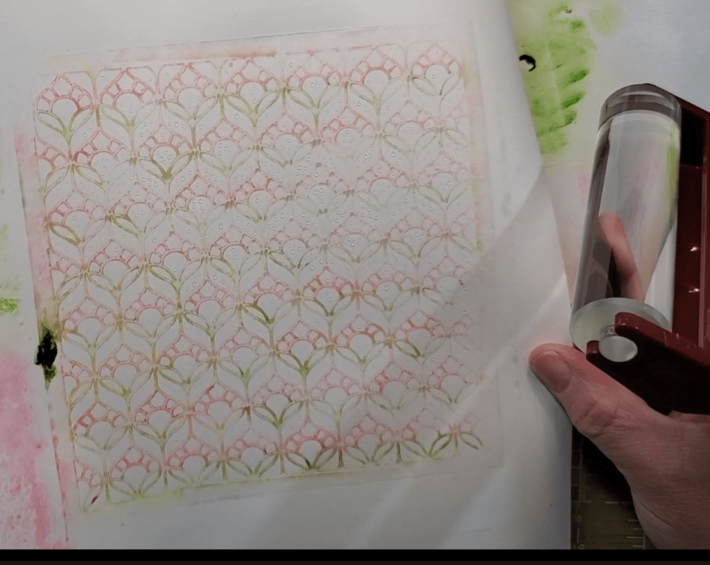 BUT, don’t stop there. You can use the color left on the stencil to get a second background for free! Just tape the stencil to a clean palette pad and spritz it with some water. Then place a piece of cardstock over the stencil and hold it in place with one hand and use a brayer with the other to roll over the cardstock so it will absorb the color from the stencil. The brayer I’m using is a speedball acrylic brayer. I bought it as a combination pack which came with other types of rollers such as rubber and foam.