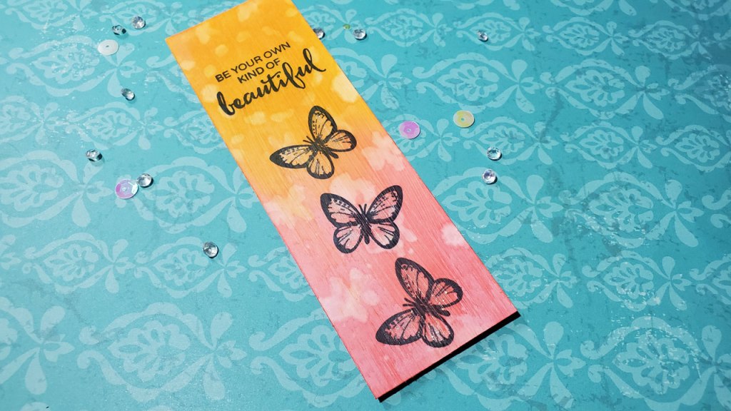 I used the same inking technique on the front and back of the bookmark pictured below. Then, I used the same flower stencil seen in the video with a water brush to pick up some of the ink. The water didn’t stay neatly within the stencil outline, so it’s hard to tell they are flowers in the background. However, it still creates some layers and interest on the bookmark. If you don’t like the look of it, you could use some white ink and stamp some flowers. Next, I stamped a sentiment and some butterflies using memento tuxedo black ink. Once it was all dry, (you can use a heat tool to dry it), I brushed some liquid matte medium to seal it all in on the front and the back. Last, I added some sparkle to the butterflies using a Wink of Stella clear brush pen. The measurements of the bookmark is 1.75″ x 5.5″ so it will fit in the card to mail to the recipient.