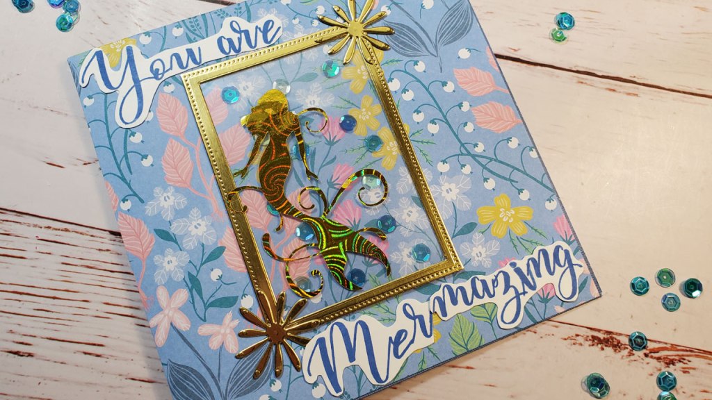 - Use a mermaid die or electronic cutting machine and some gold, holographic paper to cut out a mermaid that is a little smaller than the “window”.