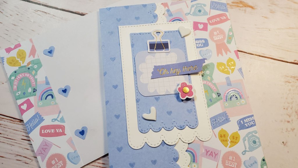 Today, I’m making a hello card. I’m using supplies from a monthly subscription card kit by Spellbinders. The kits are available as stand alone purchases if the don’t sell out, but they will cost more per unit than if you purchased the subscription. Of course, you can always follow the layout and use your own pattern paper to make a similar card. You’ll need to choose two pieces of pattern paper: one that is monochromatic like the blue one below (it only uses blue colors, one lighter and one darker) and one that is bold and busy, but has the same color as the monochromatic piece. Use the dies listed below to cut out the tags and put the scallop border on the edge of the pattern paper and white cardstock. Then, you’ll have to decorate the tag any way you’d like.