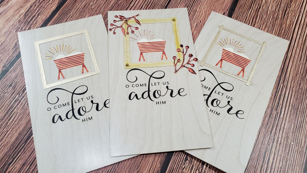 Of course, I also wanted to add some sparkle and bling so I used my gold and silver Unibal gel pens to trace some of the light rays emanating from Jesus and added some dots to the word adore. In addition, I placed some clear gems above the light rays on one card, some Crystal Nuvo drops on another, and some pearls on a third. I hope you enjoy the video above.