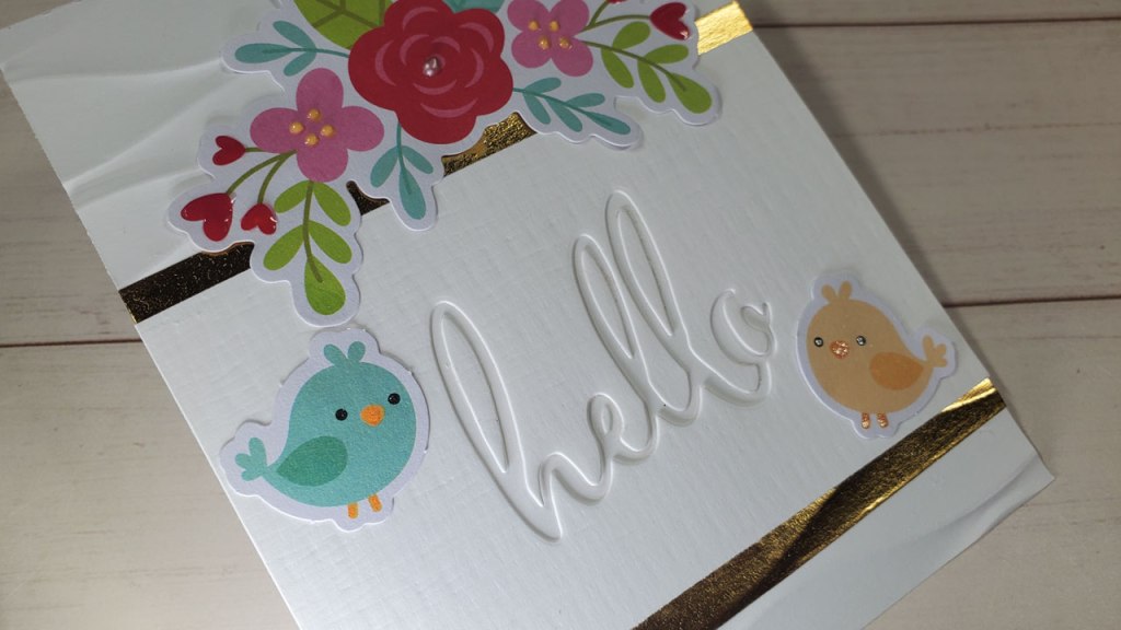 The adorable little birdies needed some glitter, so I used my glitter gel pens in black, yellow and orange to go over their eyes, beaks, and legs! Finally, I added some crystal nuvo drops in sugared almond for the flower centers, in morning dew for the hearts, and some Scrapbook.com pops of color in rose gold for the center of the rose. I love Scrapbook.com. They almost always have a FREE item with purchase. That’s how I got the adorable Love Notes Odds & Ends die cut shapes you see above.
