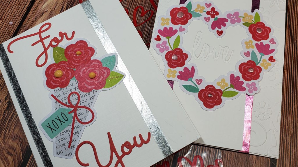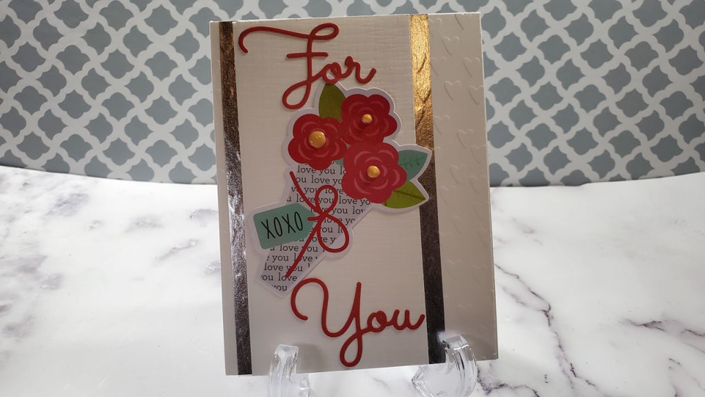The cards have several layers which make them eye catching and interesting. For the background, I used 80lb cardstock and Valentine’s Day themed embossing folders. One with hearts and one with lots of fanciful images. On top of the background, I added a strip of 80lb cardstock that was not as wide as the background but was as long -like a bookmark, but a little wider. The first card features a strip that is 2.75″ x 5.5″. I offset it to the left a bit.