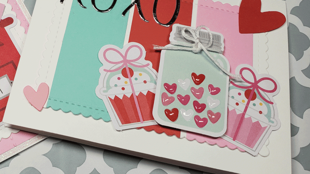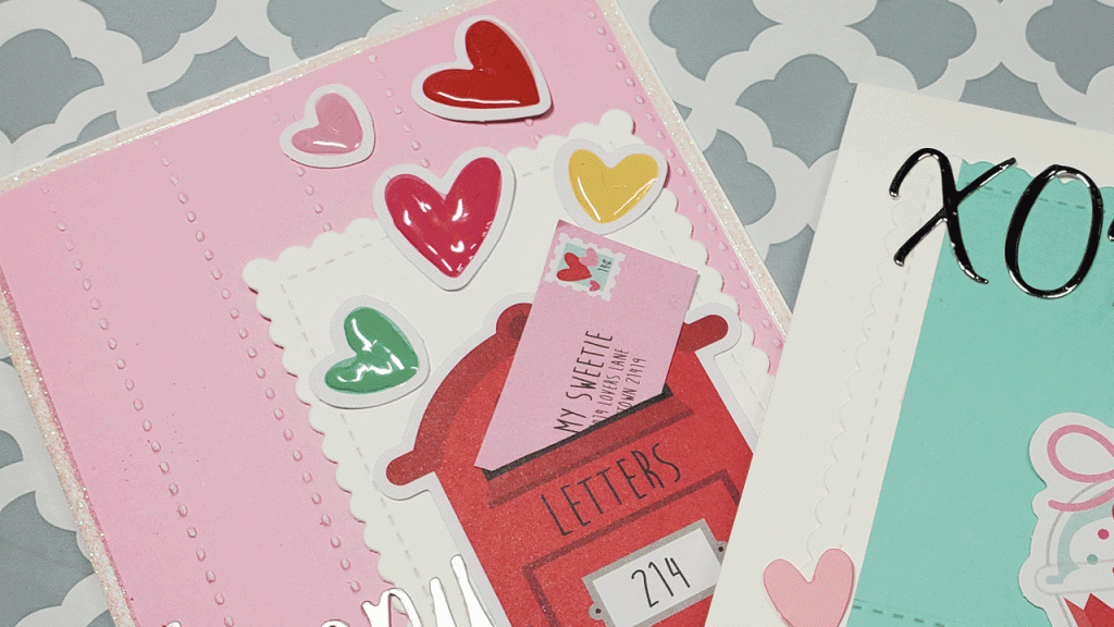 That texture makes a smooth white surface look more interesting and catches the eye! I’ll just trim it down with a stitched scalloped rectangle die and it will serve as a mat for my focal image, which is a cute little mail box. Behind that, I’ll place the front panel, which is a pink piece of cardstock that I’ve embossed with a Cricut embossing folder called, “Fabric Swatches Set” which just puts some stitched, vertical lines in the cardstock. I”ll trim that down to 5.25″ by 4″. I’ll use a craft knife to cut a slit in the mailbox and put the cute little envelope die cut shape in it. To add more visuals, I’ll place several hearts in various colors and sizes above the mailbox and use some Crystal Nuvo Drops in Morning Dew to add some shine and dimension to them (Glossy Accents would work here, too!) You can see all of this in the image below.