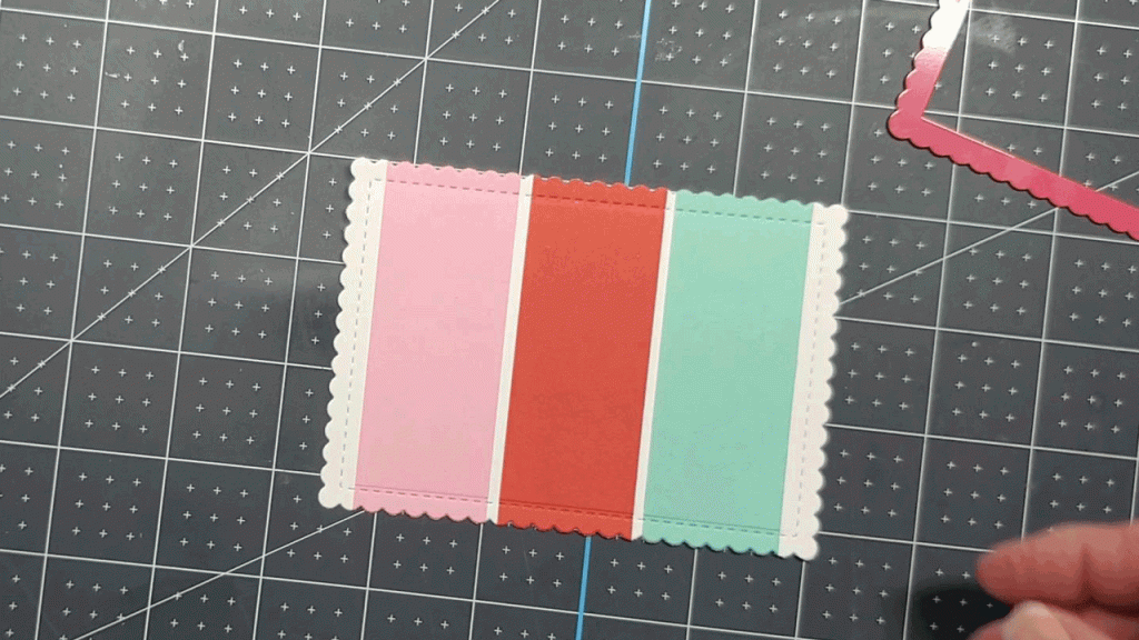 For the second card, I simply cut the red, pink, and light green cardstock into 1.25″ x 4.25″ strips and adhered them to a piece of 5.5″ x 4.25″ lightweight (80lb) white cardstock. I used the stitched scalloped rectangle die to cut them out and then adhered that to my card base (110lb cardstock).