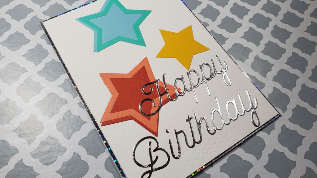 Layout the stars on the front panel in a way that is pleasing to your eye. I chose to use 3 stars two large and one small, along with a frame for the 2 larger stars. I offset the frames from the stars. Adhere those to your card panel. Then cut out the word Happy Birthday from mirror silver cardstock using the Scrapbook.com word dies and adhere them to your card panel. Trim the panel 1/8″ on all sides.