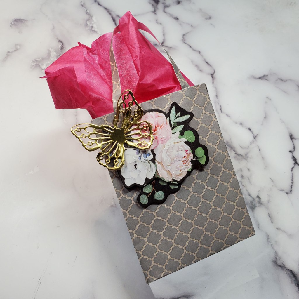 I used the die with some patterned paper to create the gift bag. Then, I used some die cut shapes and dimensional floral stickers to decorate the bag: all of which came from Spellbinders products. The pattern paper is from the Beauty is Everywhere paper pad. The flowers and butterfly are from the Spellbinders Card Kit of the Month for December 2021, which happens to be the kit the paper pad comes from and shares the name, Beauty is Everywhere.