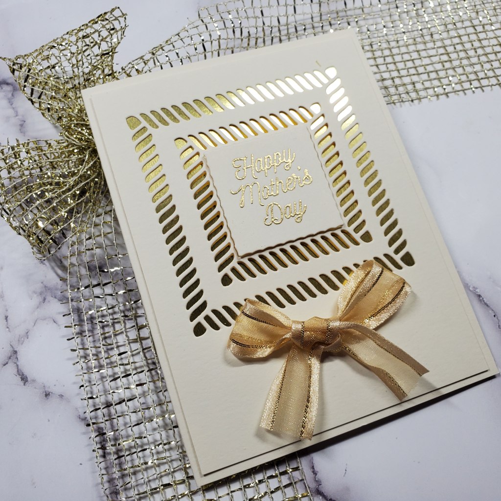 This is the perfect stamp set for this time of year, with greetings appropriate for many Spring occasions. I’m making a Mother’s Day card with the stamp set, along with a die set they released last year called, “Elegant Twist Squares” and some of their mirror gold cardstock.