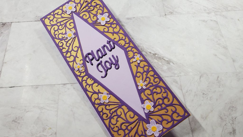 The set comes with the words, “Plant Joy.” I cut them out of the same dark purple that I used for the decorative die and I also cut it from black cardstock and adhered the purple and black layers together with the black slightly askew so it creates a shadow for the words.