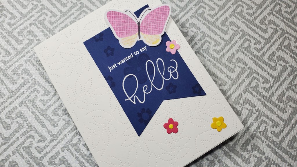 Use elements to guide your viewer’s eye to where you want them to go. On my card I used the tiny, colorful flowers to create a triangle that causes the viewer’s eye to go from the butterfly to the sentiment to the inside of the card.