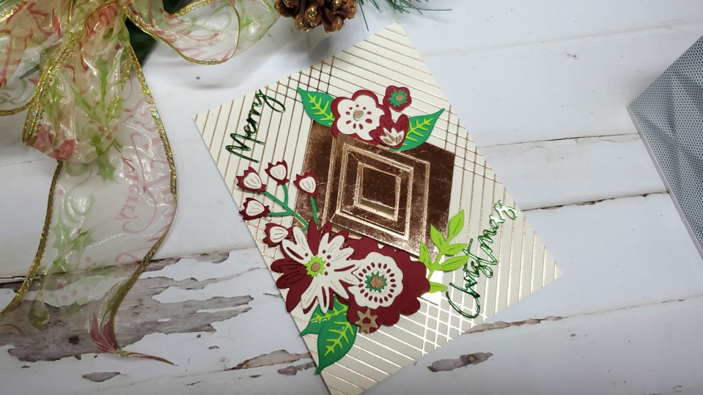 Today, I’m making a Christmas card with the new Spellbinders release called, “Glimmer Greetings Collection.” The Glimmer Essentials Solid Diamond Hot Foil Plate creates a beautiful and stunning center point for any card you’d like to make, for any occasion. I used it in coordination with the Essential Diamonds Etched die set to create the dimensional diamonds on the center of my card. The crossed lines on the background were created using the Crossed Lines Cardfront hot foil plate, also from the Glimmer Greetings collection. The beautiful flowers are from the Simply Perfect Layered Blooms Etched dies from the Simply Perfect collection.