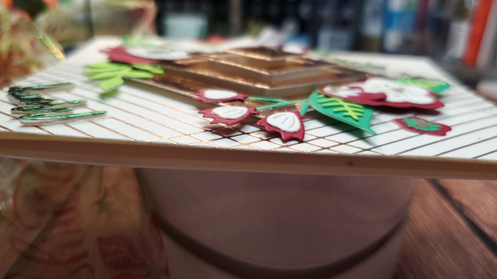 The colors I chose for the card seen above were based on the fact that I wanted to use the alabaster cardstock from Spellbinders color essentials line and the glimmer hot foil in blush color. The two colors go well together. The blush looks more like a bronze color against the alabaster cardstock. For the flowers I chose a dark red, which I think really goes well with the bronze and alabaster. I chose a mirrored green cardstock for the greeting: Merry Christmas, which were cut with the Create a Christmas Sentiment Etched Dies. I decided to layer the words on top of each other by cutting out each word three times from the alabaster cardstock. I glued them together and then topped it with the green mirrored word.