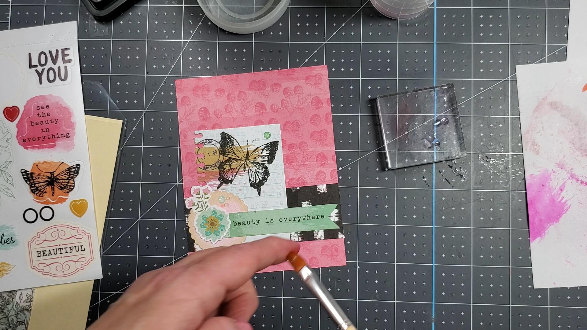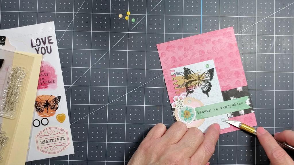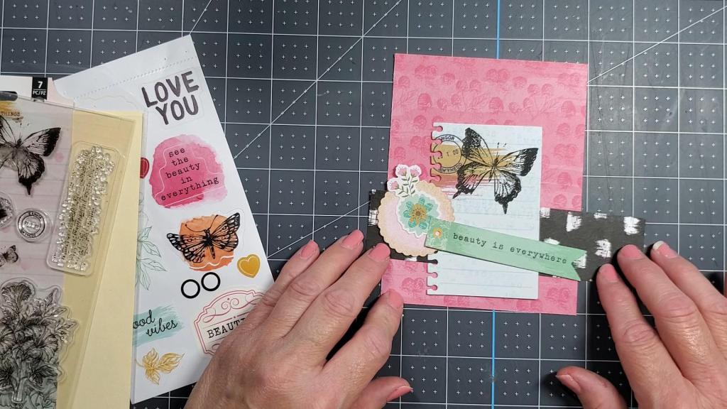 Today, you can see I’m using pink and black as my main colors with splashes of green and tan. The paper is from the BoBunny collection mentioned above. It’s called, “Painterly,” and it’s a 12″ x 12″ sheet of paper. The front side features raspberries and the back side is the black and white pattern you see. I simply cut a 1.5″ x 5.5″ strip off of the sheet and flipped it over before adhering it to the 4.25″ by 5.5″ piece for the background.