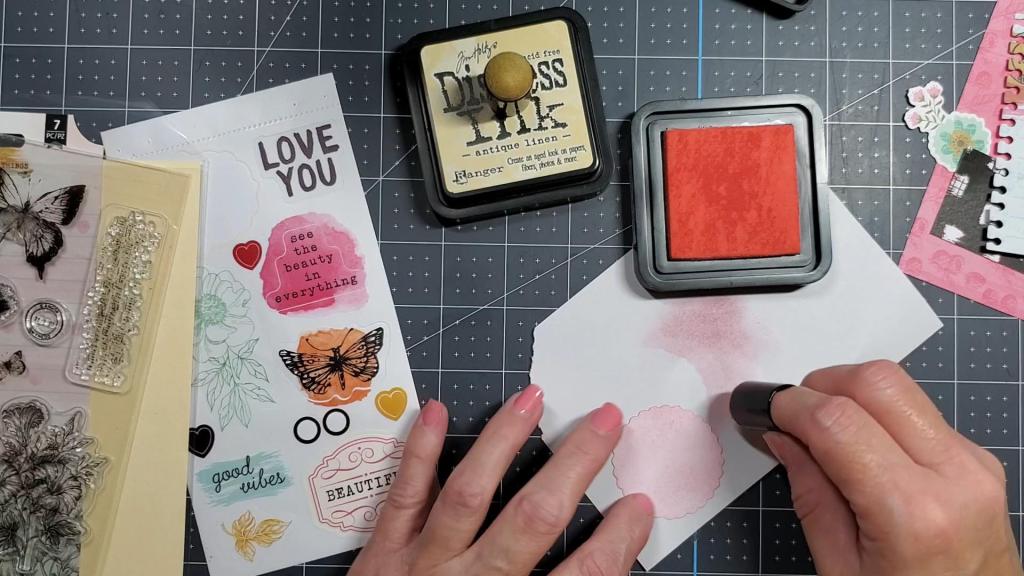 Next, I am adding some distress ink to the back of a piece of ephemera. I didn’t like the image of the insect on the front, so I repurposed it! This is the Spun Sugar. I’ll go around the edges with the Antique Linen.