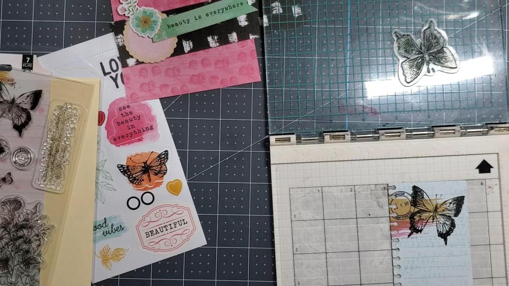 I used some Versa Fine Onyx Black ink to stamp the butterfly using my Stamping Platform by We R Memory Keepers, which I love. It’s small enough to make it easy to work with and it has hinges that allow me to use clear or cling stamps without having to remove anything or switch anything around.