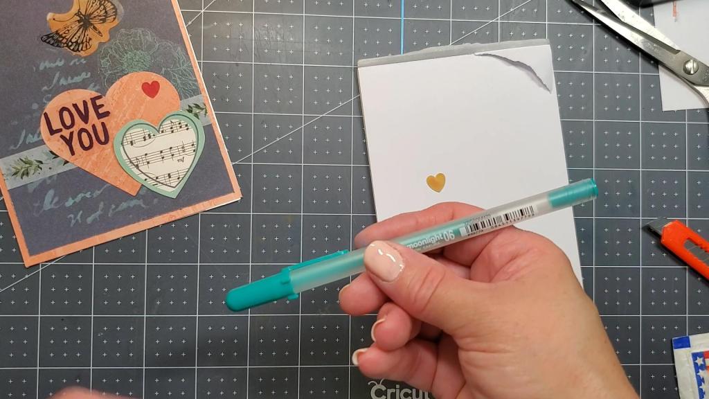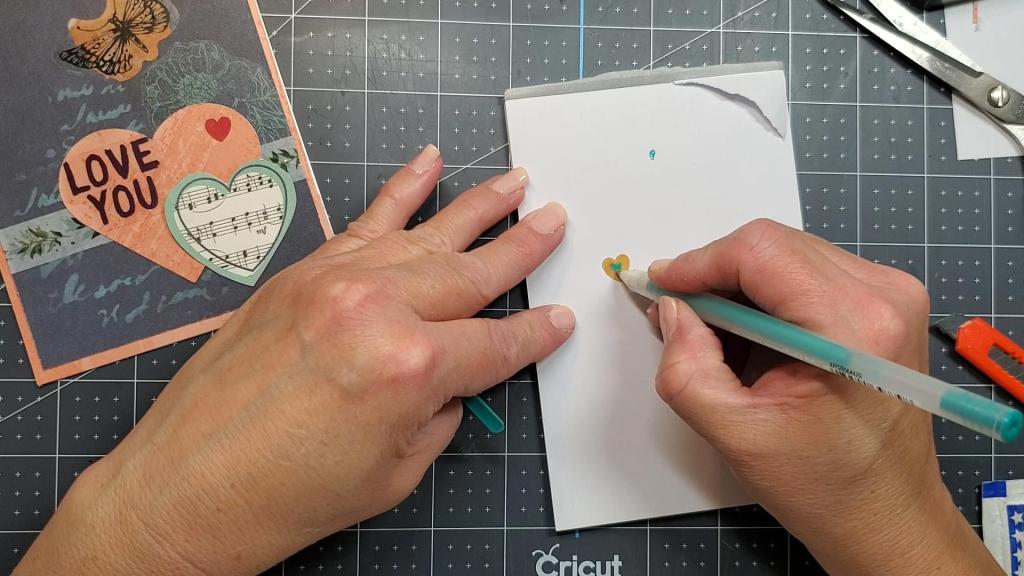 I placed the paper hearts and the small sticker hearts last. You’ll notice that I colored a green heart on the center of the tan heart with a gel pen from Sakura Gelly Roll Gel Pen called Moonlight pen in the color green. These pens are opaque and the color will stay true even when coloring on images that are a different color than the ink in the pen.