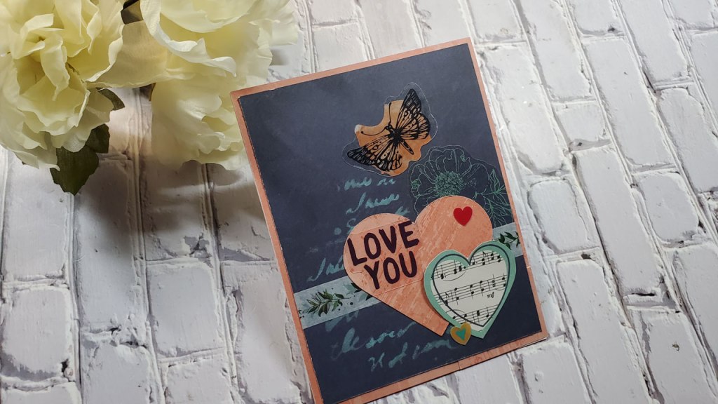 As you can see from the image above, there are lots of different media used on this card…hence the mixed media look. I used the “Noted” and “Beauty” pattern paper from the “Beautiful Things” collection from BoBunny to create my background and mat as well as the the hearts. I’m providing the product information for your convenience in case you’re interested in it. I am not an affiliate with BoBunny and I purchased the supplies myself, however, I do earn from qualifying purchases you make with the links from Share a Sale and Amazon (at no extra cost to you). Thank you for your support! The card is an A2 sized card (4.25″ x 5.5″) cut from Neenah Solar white 110lb cardstock. I cut the blue paper to 4″ x 5.25″. The orange paper is 4.25″ x 5.5″. The large heart was cut using Sizzix heart dies and the small one was fussy cut from the pattern paper.