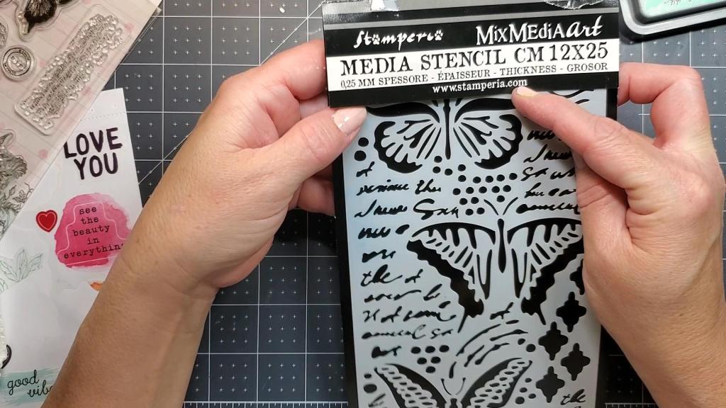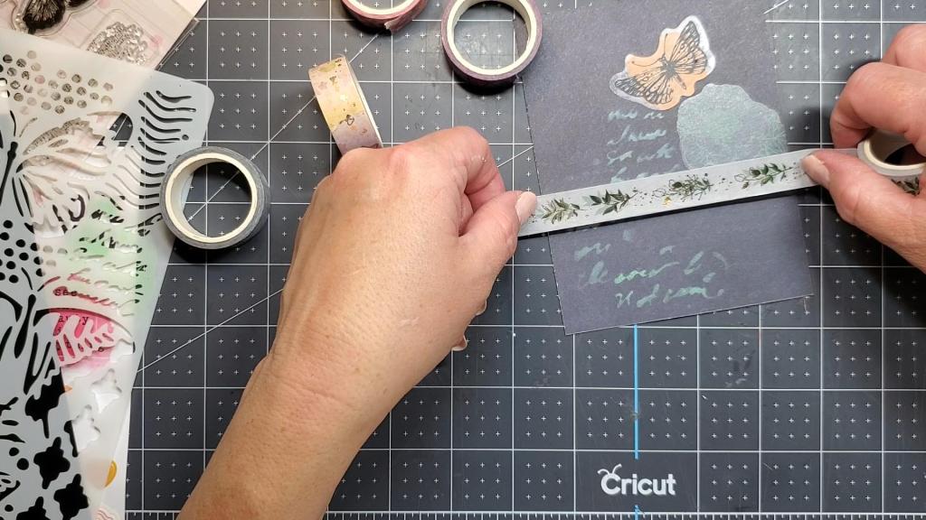 I layered the stickers on first, determining their placement by using the paper hearts as a guide. The script in the background was done using a stencil from Stamperia with some distress oxide ink in the color cracked pistachio. I wanted the script to flow aroung the hearts so I used them as a guide here too. The washi tape is from Amazon.