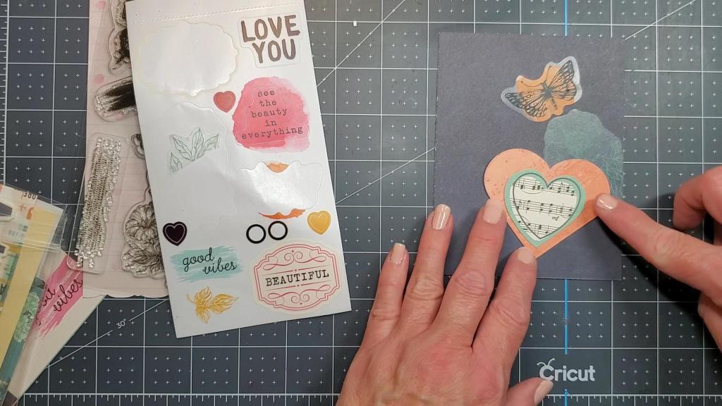The flower, butterfly and small red and tan heart are stickers from the BoBunny collection mentioned above.
