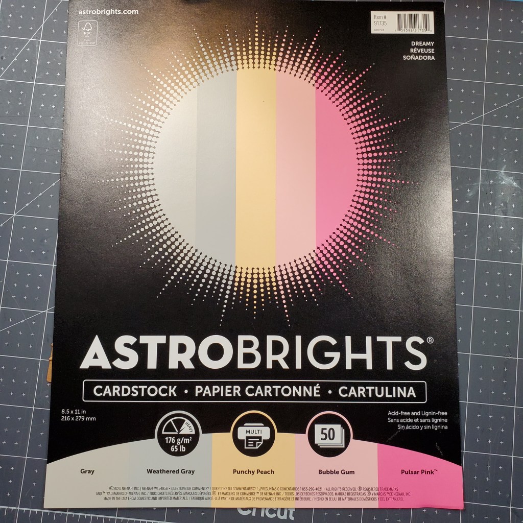 The cardstock is from the Astrobrights Dreamy paper pack which includes assorted colors of cardstock which are acid and lignin free. I chose the Punchy Peach, Bubble Gum, and Gray colors for my cards. I purchased this cardstock from Walmart. I love how the colors work so well together.