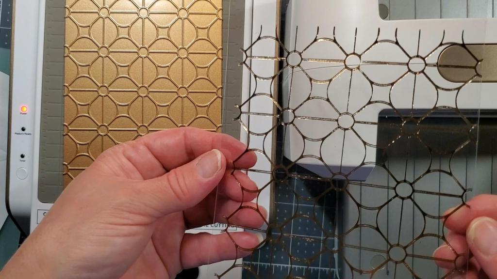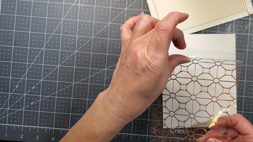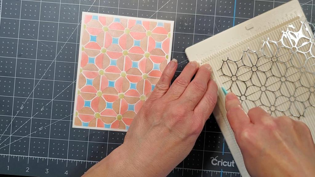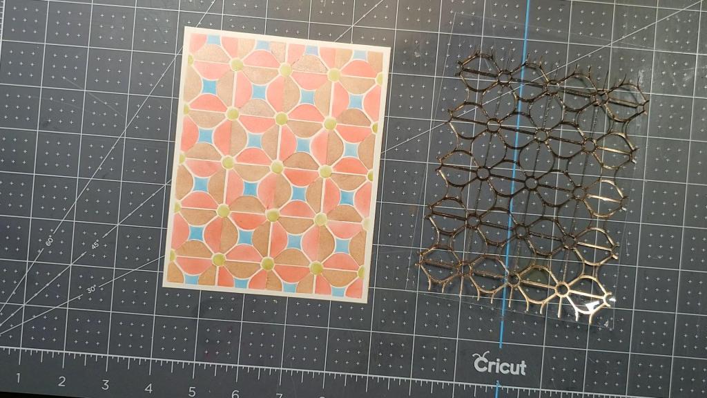 The second layer is the heat resistant acetate with the glimmered/foiled Geometric Flower Background design created with the Geometric Flower Background hot plate and glimmer hot foil in blush color.