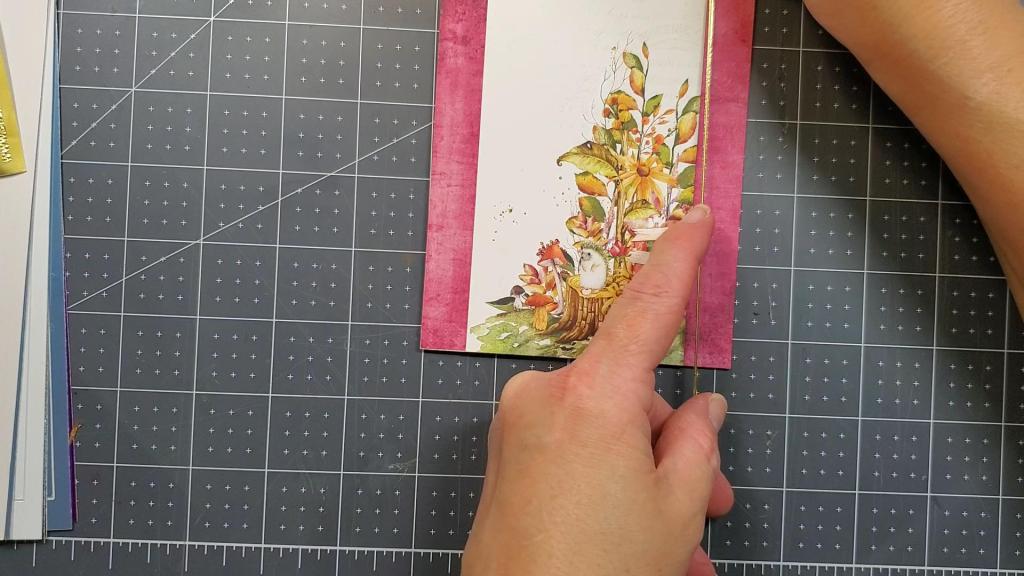 Those reddish purples and turquoise colors are so beautiful! The layout on these cards is fairly basic. I simply added some decorative borders along the edges of the panels. I did this in two ways. First, I used a paper punch I’ve had for quite some time. The strip of paper measures 1.25″ by 5.5″ before it was cut with the punch.
