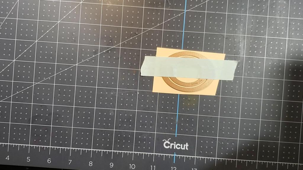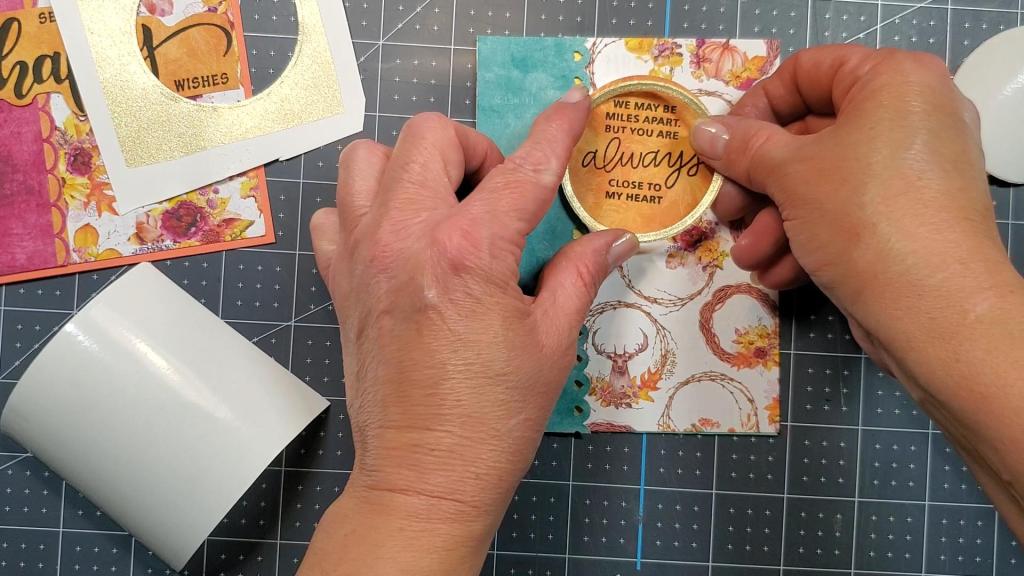 The two strips of reddish purplish paper seen above measure 1.5″ x 5.5″ each. The card below shows how I framed the circle sentiment in gold vinyl by first adhering the gold vinyl to cardstock and then cutting out a circle frame by using two circle dies, one inside the other. The strips of turquoise and reddish purplish paper seen below measure approximately 1.75″ x 5.5″ before using the border punch.