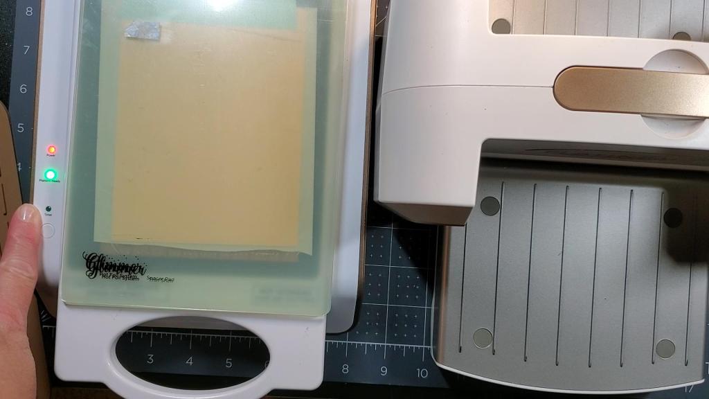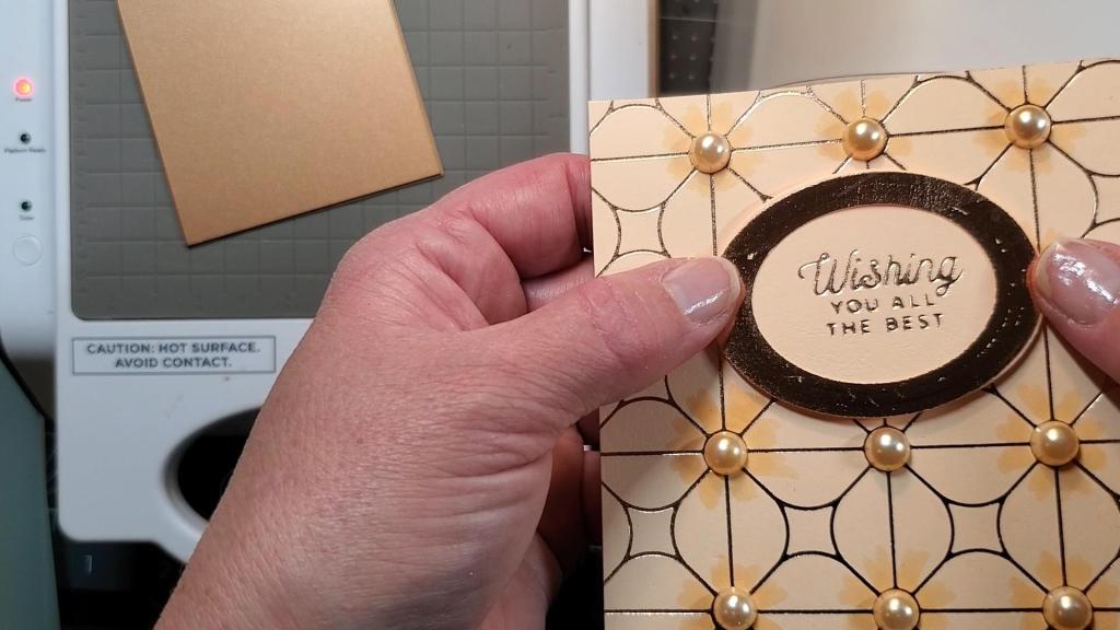I then decided to add some blush foil to the frame, however, it didn’t foil well because the dies I chose to use also emboss the shape. Since the recessed areas were not able to be foiled, I would recommend using oval dies that do not emboss to create the frame. You need a flat surface to get a solid foiling. I achieved the foiled frame by using a solid hot plate. I used the Glimmer Essentials Solid Arch, but you can use any shape of solid hot plate you have as long as it’s large enough to cover the oval frame.
