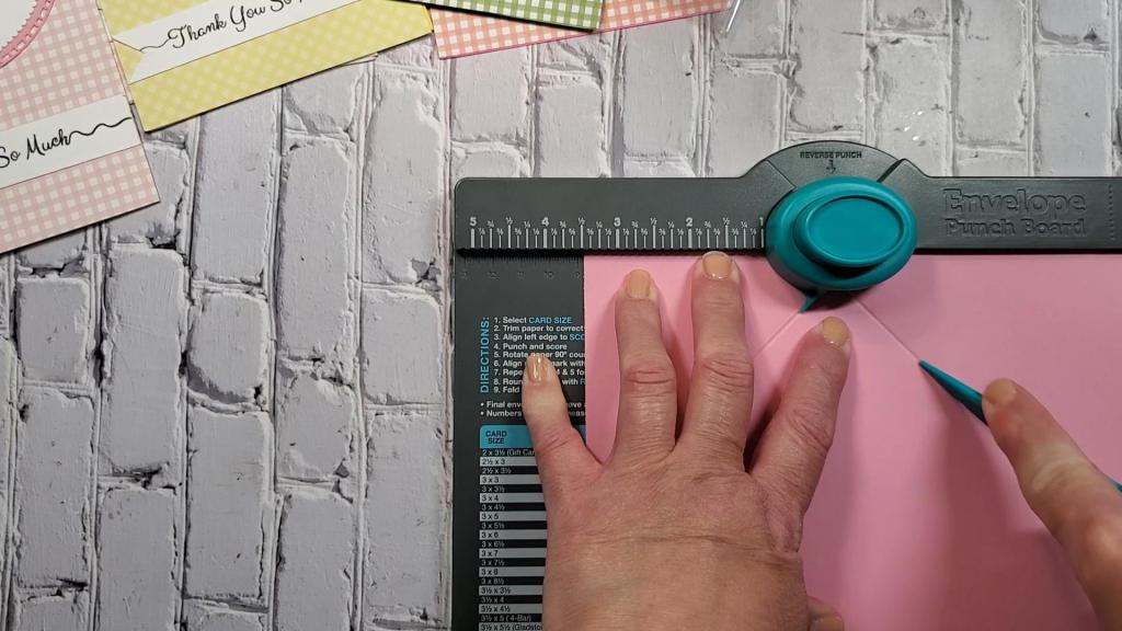 You can see the envelope being made on the punch board below. Of course, you’ll have to cut the paper to the proper size before doing this step. You can see this process in the YouTube video below the photo.