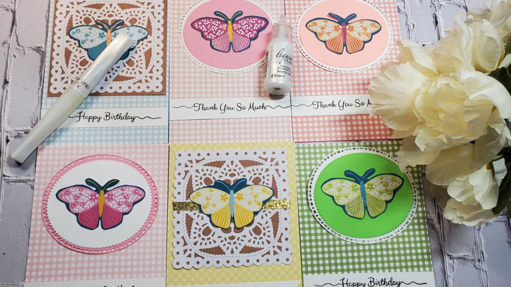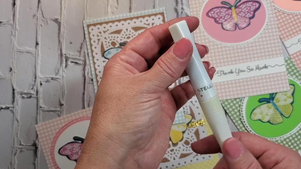 As you can see from the photo above, I varied the background on two of the cards. You’ll see a brown “lacey” looking pattern behind the yellow and blue butterfly, I fussy cut all around the edges of brown lacey pattern on the yellow card but I did not on the blue one. The butterflies are beautiful, but to kick it up a notch, I used a Zig Wink of Stella Glitter Brush Pen to add some sparkle to them.