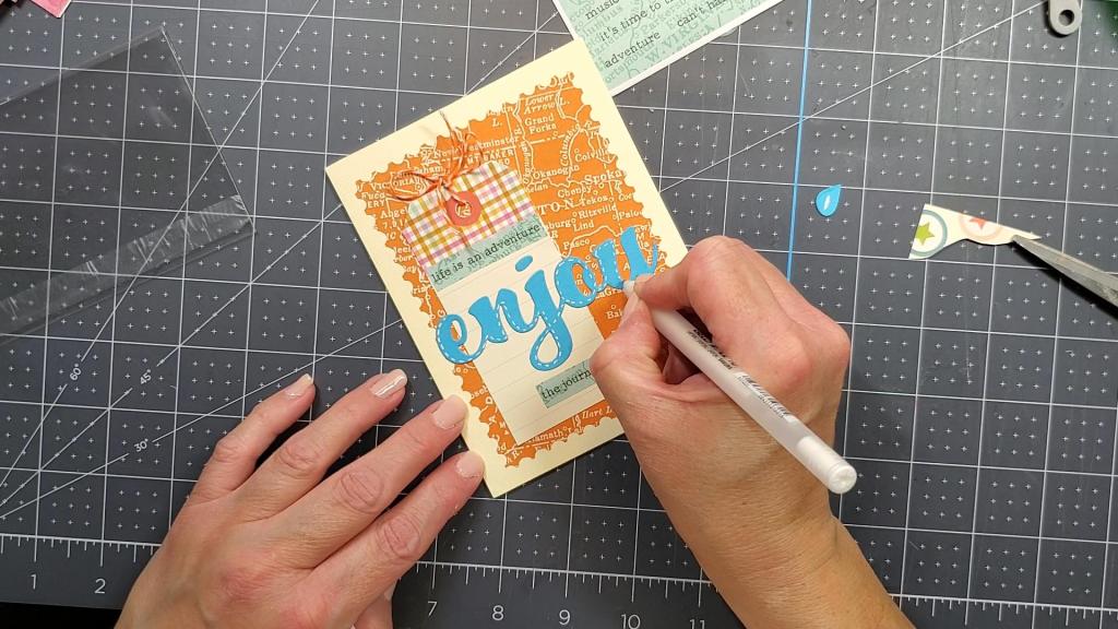 This card was easy and fun to make, but it seem like I say that a lot. I guess I just really really like making cards. I used a border punch from American Crafts to put the fancy edge on the orange pattern paper. Beneath the orange paper is a vanilla cream paper that has some texture to it. I cut the word enjoy with the die that came in the SCT Sampler. I used a white gelly roll gel pen to add white dashes all around the word enjoy. The tag and stars are from the paper collection from Simple Stories called, “Let’s Go.” I just trimmed about 1/4″ off the left and right side of the tag to slim it up, and used a hole punch to punch the hole at the top. The words are stickers from the same collection. The stars were on a piece of pattern paper and I used a circle punch to punch them out. The bow is tied with baker’s twine in an orange color to match the back panel.