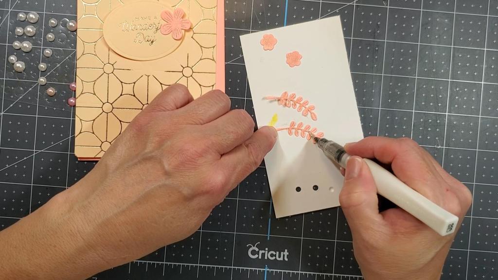 I added some flower and leaf die cuts to embellish the oval. They were cut using the Be Bold Etched dies from Spellbinders. I added some color to some of them using my alcohol markers and some sparkle to some using the Zig Wink of Stella glitter brush pen in clear.