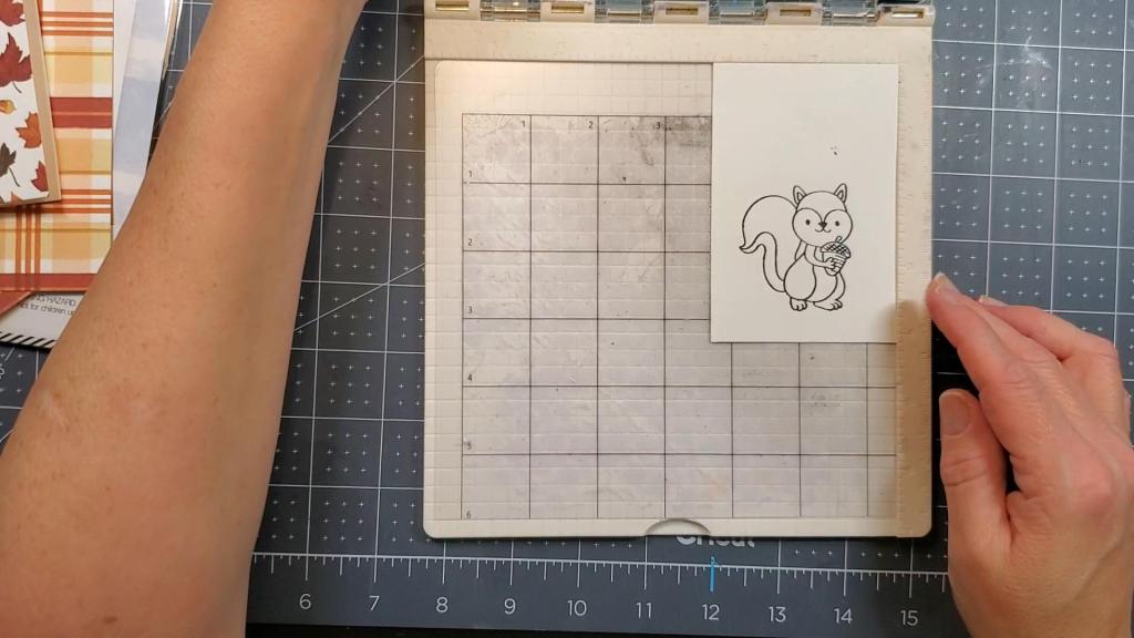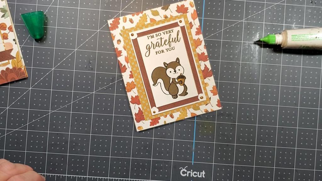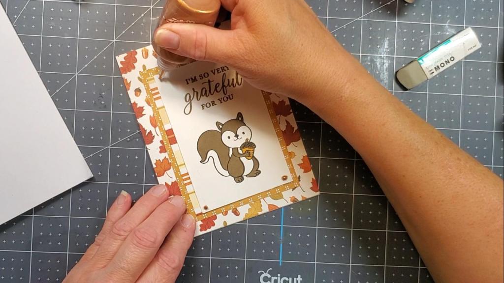 I started by cutting the leaf paper to an A2 size, 4.25″ x 5.5″. I adhered that to my cardbase of the same size made from Neenah Solar White Classic Crest Cardstock 100lb weight. The polka dot pattern paper was cut to 3.25″ x 4.5″ and the white cardstock with the squirrel stamped on it is 2.75″ x 4 and 1/8″.