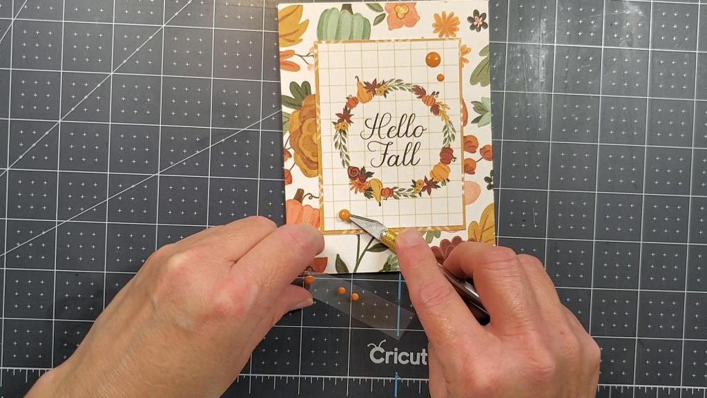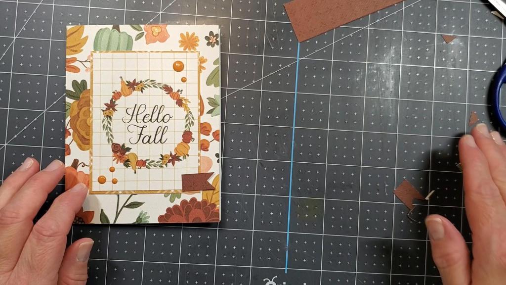 This particular card features patterned paper from Carta Bella called, “Welcome Fall.” I just used my paper trimmer to cut it to the sizes I needed. This is a very traditional looking card with everything centered.