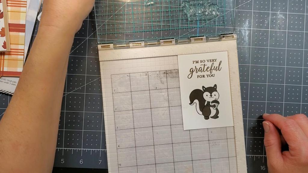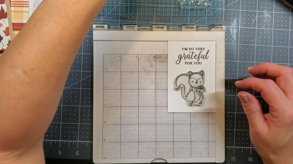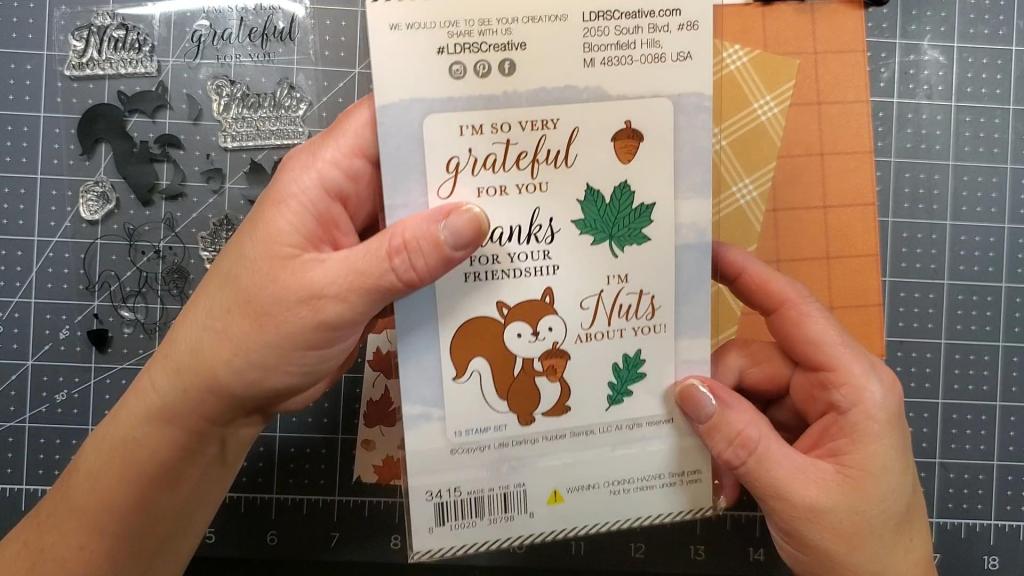 Today’s card features a layering stamp set from LDRS Creative called, “Grateful for You.” There is a cute little critter holding an acorn in this stamp set. I received it in the Scrapbook and Cards Today sampler subscription, which comes monthly and includes samples of many goodies from various companies in the industry. It’s a great way to add to your supplies or build them up if you are just getting started with papercrafting, cardmaking, or scrapbooking.