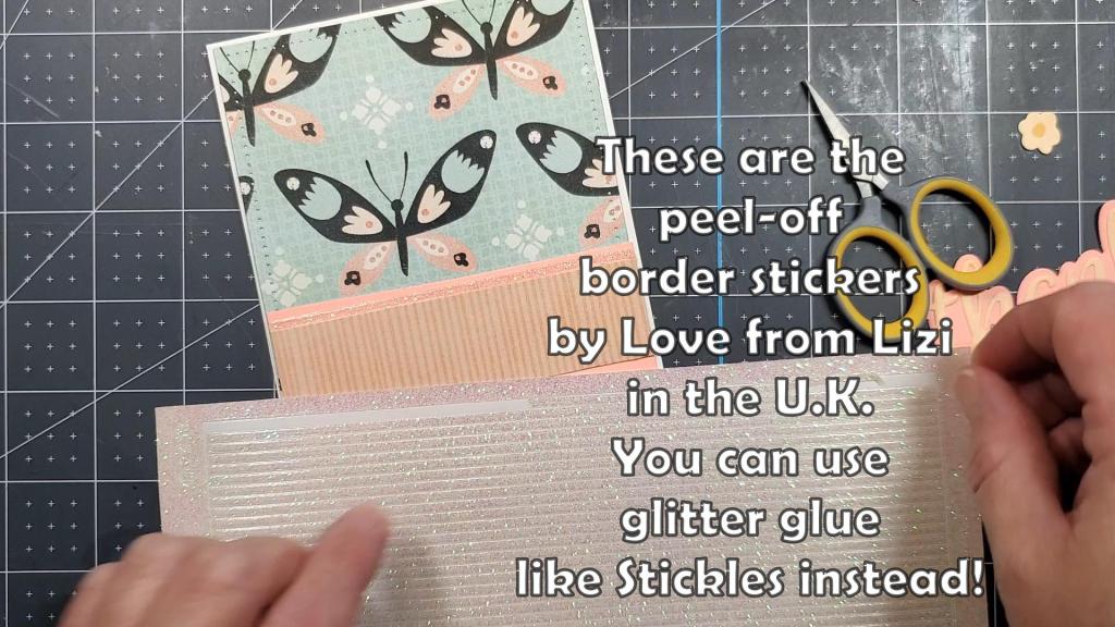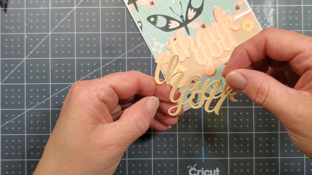 I embellished the card further by adding some iridescent border stickers along the top and bottom of the striped cardstock which mats the thank you word die cut. If you don’t have those, you can use a glitter glue such as Stickles.