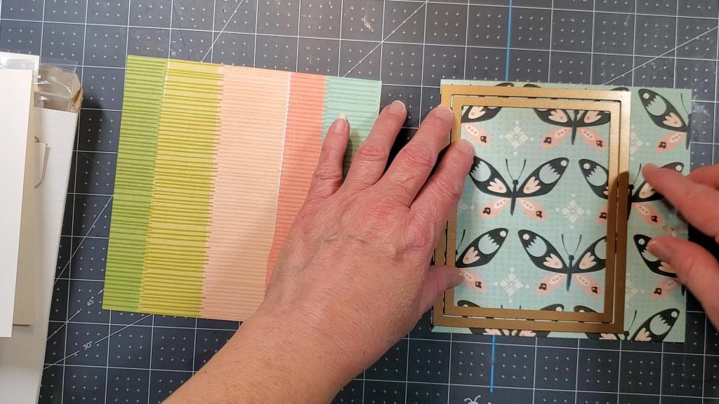 You may notice the dots around the edge of the butterfly patterned paper. Those are actually perforations made with the Spellbinders Pierced Rectangles die set. This set is an older set I’ve had for a while and it’s no longer available at Spellbinders, but you may be able to get it on eBay or Etsy.