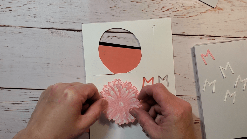 Last, adhere the first die cut (the one you did from the stamped image) on the top of those layers of M’s. Be careful not to smudge the top “M” because the image on it must remain in tact for the 3-D effect to work. Adhere the three-dimensional “M” to the stamped image you cut out (not the one with the “M” already cut out of it). Make sure you place it so that it matches the image-it’s kind of like a puzzle. I used the stamped image with the “M” cut out of it to match up with the one I cut out so I would know the orientation of the flower (which is the top, bottom, right, and left side) to help me place the “M”. I demonstrate this in the video below.