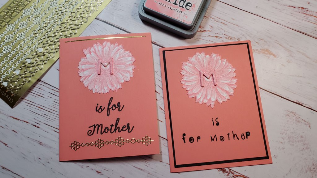 Finally, decorate your card with a greeting and a finishing touches. I used some peel-off border stickers to bling it up and I used a letter stamp set to place the greeting, “is for Mother” below the flower. The 3-D M makes the front of the card say, “M is for Mother”. I also decorated the inside of the card with the same flower stamp and peel-off border stickers. Have fun making this card for your mom!